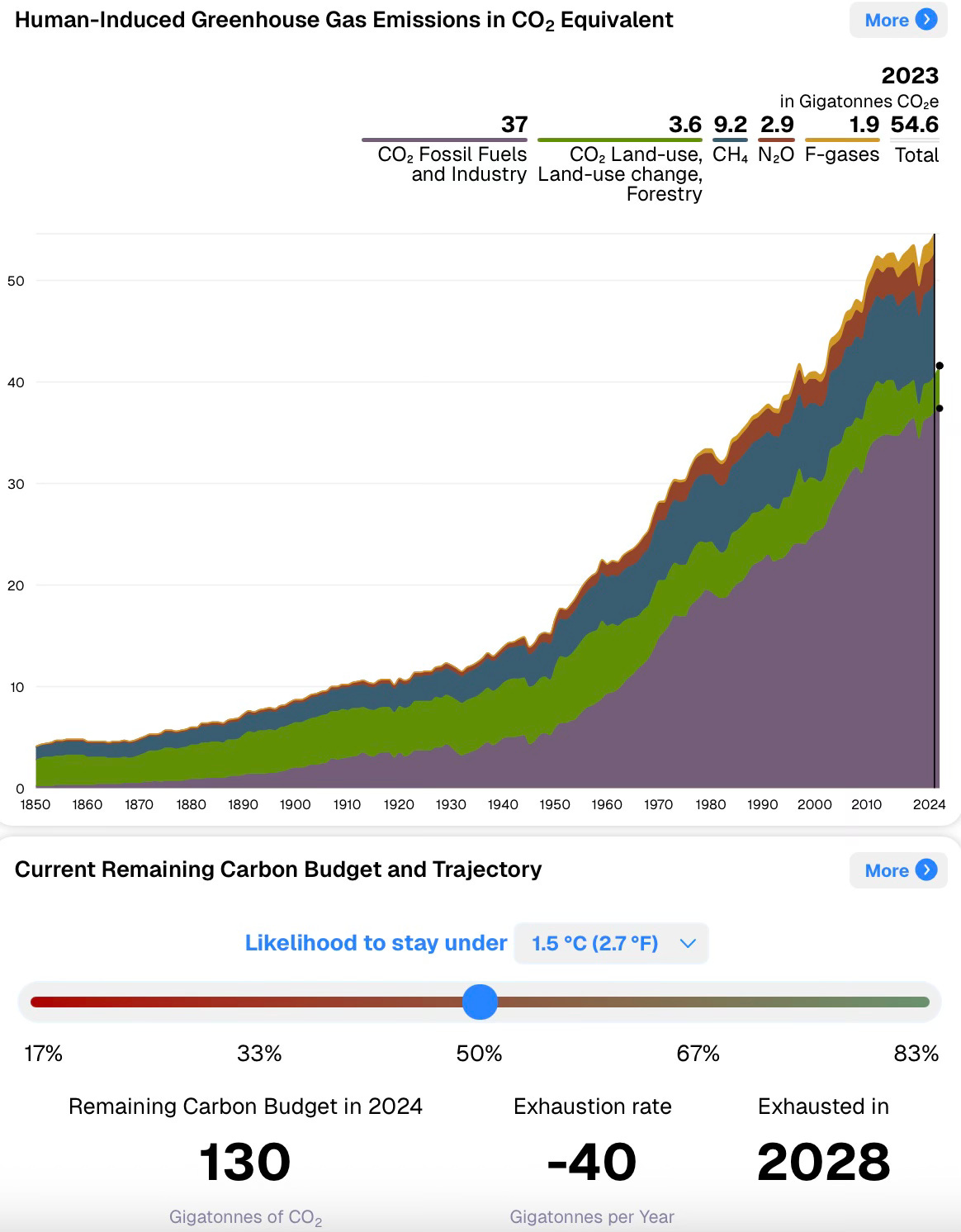 The carbon budget to ensure climate warming stays less than 1.5 degrees above pre-industrial levels has fallen to just three years of emissions. See more in Chart of the day below.