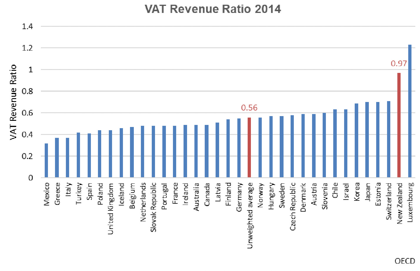 This removes any doubt, but it’s not filling a hole in the GST net that is significant. New Zealand has the second most comprehensive GST net in the world. Only Luxembourg’s is wider, and that’s specifically because it does charge GST (Value Added Tax) on financial services provided to non-residents. This Tax Working Group chart from OECD data tells the story.