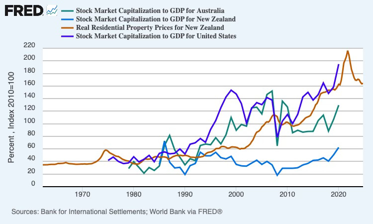 The collective value of residential property nationally is the $1.64 trillion fact at the heart of our $420 billion a year economy. Our stock market is worth one-ninth of our housing market and about 40% of GDP. That’s not normal. Australia and the United States have housing markets and stock markets worth about one to two times GDP. New Zealand’s housing market is worth nearly four times our GDP. This chart shows how our housing market has raced up relative to GDP and our stock market since the early 1990s.
