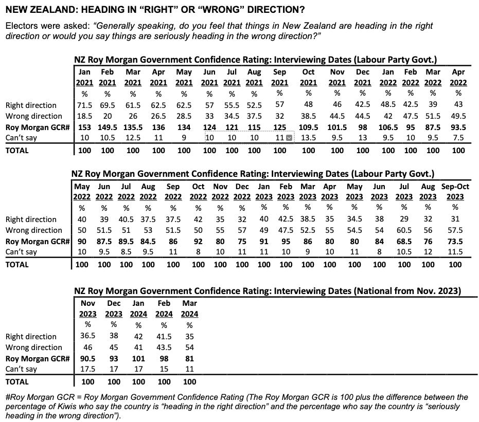 A Roy Morgan poll taken last month and published last night shows confidence in whether the country is on the right track or wrong track collapsed by 17 percentage points in March from February, which is more than it fell during any of the covid lockdown months in Auckland in late 2021.