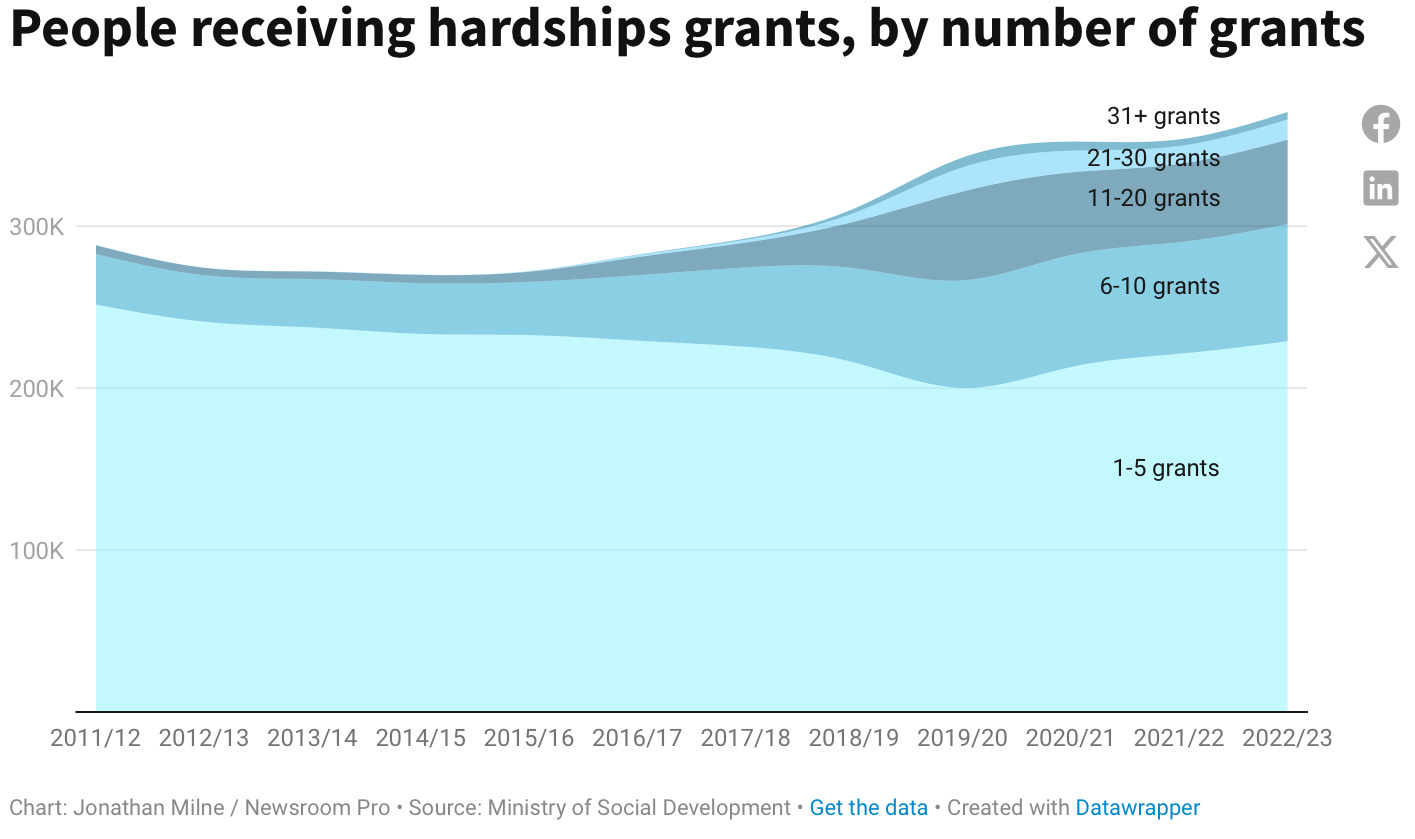 17,000 - The number of people who each received more than 21 special needs grants in the 2022/23 year, up from 340 in 2015/16. The total number of grants has increased from 856,000 in 2016 to 2.3 million in 2023. Sourced from an MSD briefing to Social Development Minister Louise Upston. Via Newsroom Emma Hatton