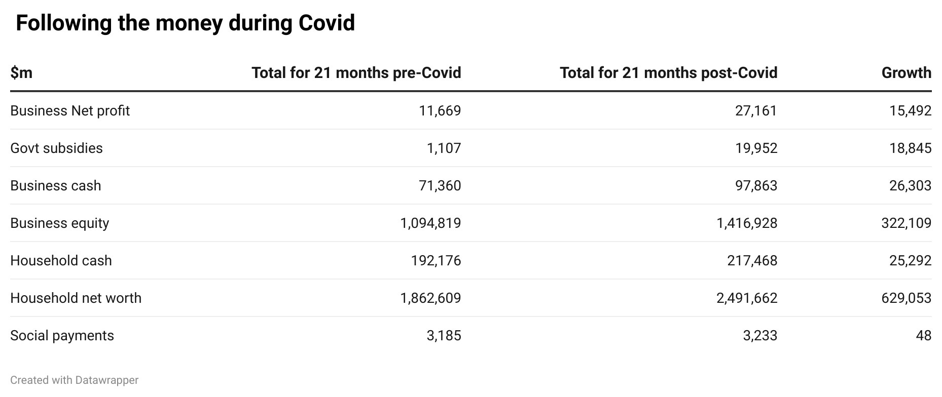 In summary, the Government’s Covid policies made the rich almost $1t richer, while the poor were allowed to get $400m further in debt to the Government itself, and were forced to apply for more than twice as many food parcels in our largest city.