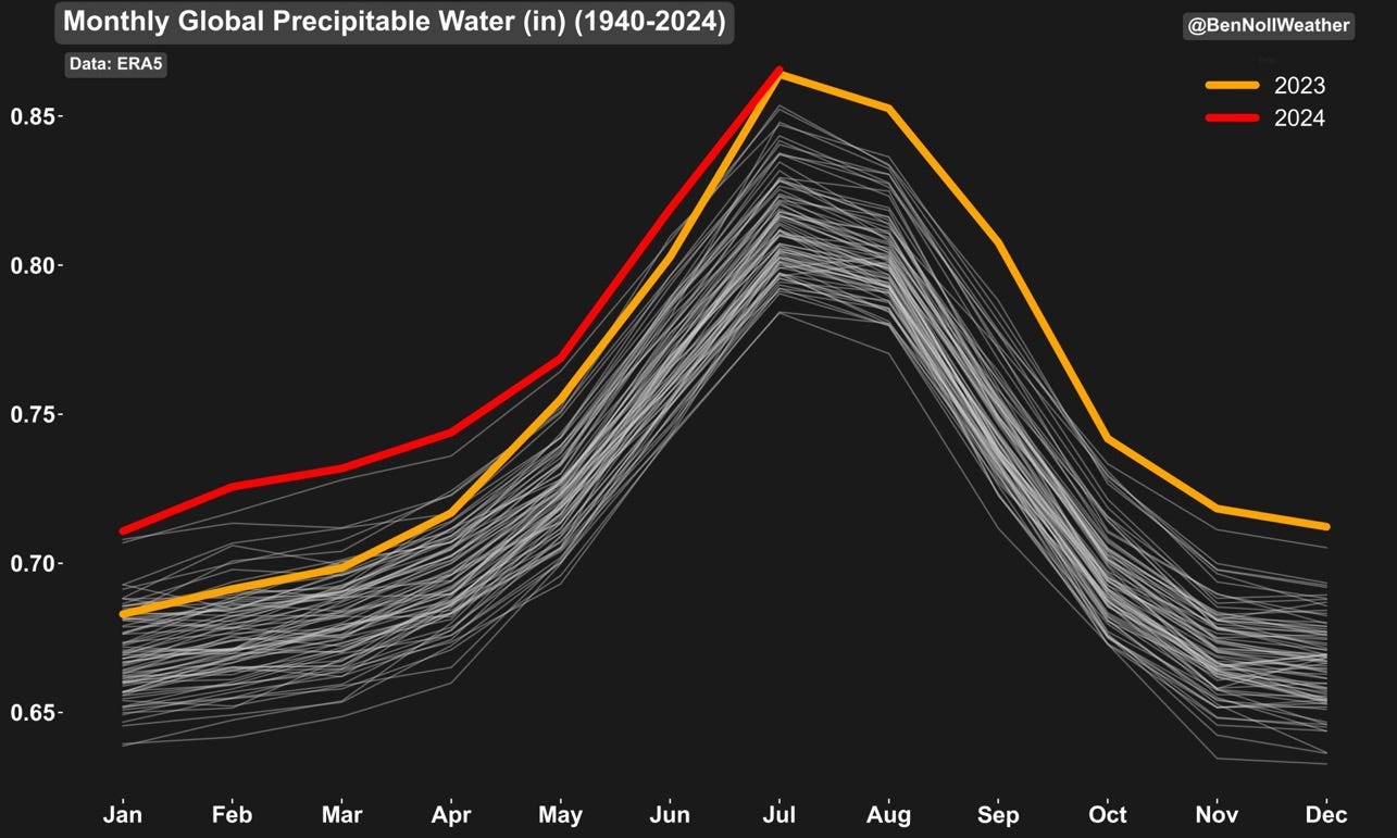 “The globe has now set atmospheric moisture records for 13 consecutive months, with the streak starting in July 2023. This has influenced an increase upper decile (top 10%) rainfall events over the last year. The moistening trend is indeed having an impact on the weather that we are experiencing.” Ben Noll via X