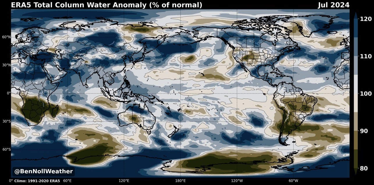 “About 70% of the planet experienced above normal atmospheric moisture during July 2024. This was associated with flooding in Texas, Vermont, parts of Mexico, Japan, Taiwan, Philippines, North Korea, China, India, Nepal, Pakistan, and Sudan. The streak of record moist months continued even as La Niña's cooler water built in the Pacific.
