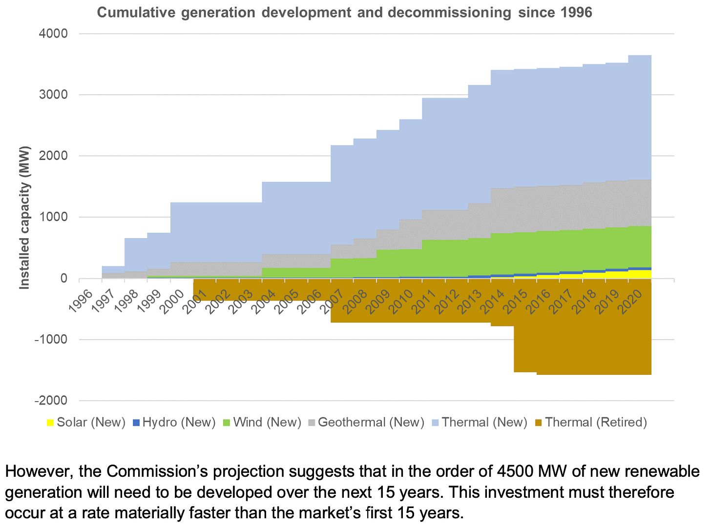 “Since the New Zealand wholesale electricity market began operating in October 1996, around 1600 MW of new renewable generation has been built in this country, and around 1500 MW of existing thermal generation has been retired. Projections generally suggest that new renewable generation will need to be built at a rate materially faster than the industry achieved over the market’s first 15 years.” EA MDAG