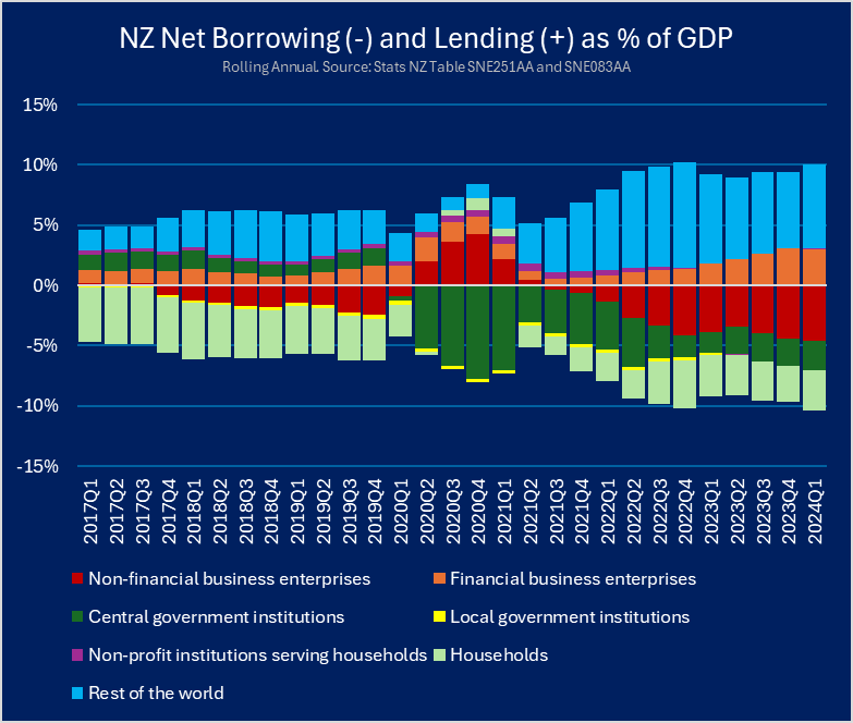 It shows that during Covid the Government borrowed heavily and that money ended up as higher supluses for non-bank businesses and households, while when the Government was a net saver from 2017 to 2019, that saw households and businesses borrow a lot more, especially from overseas. The implication is that as the Government contracts spending, it forces the load onto households and businesses, who also cut back their spending and contract the economy. That contraction and borrowing by households and businesses simply boosts the surpluses of overseas lenders and our banks.'