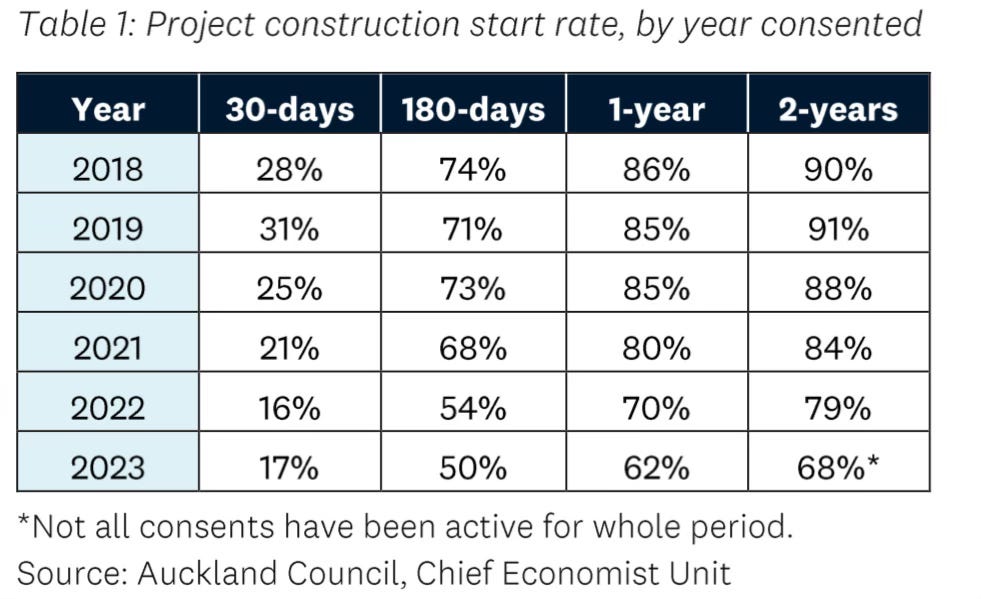 Fresh data from Auckland Council shows just 50% of building consents actually start being built within six months of the consent, suggesting a further lag in housing construction spending through 2024 and 2025 as many consents remain stalled without buyers or finance at prices builders and developers think make sense. See more in Table of the day below.