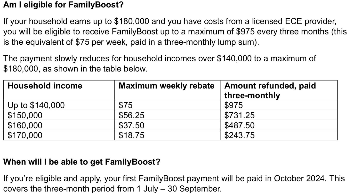 This was promised in the election, although the exact form of benefits for families as a cash payment via IRD after childcare receipts are submitted is different to the tax rebate suggested in National’s policy, and is a lower amount for large families with higher incomes. Families can only apply online and must submit invoices every three months through an IRD portal. The total cost Here’s the details via a ministerial Q&A document.