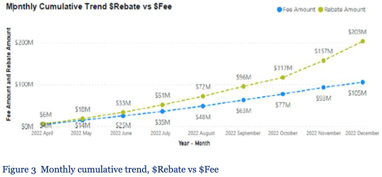 Figure 3 (below) shows the fees collected, and rebates paid out for Phase 2 of the CCD from 1 April – 31 December 2022. During this data period, the rebate expense is growing to roughly twice the income from fees. Since August 2022, the proportion of brand new EVs has risen significantly.