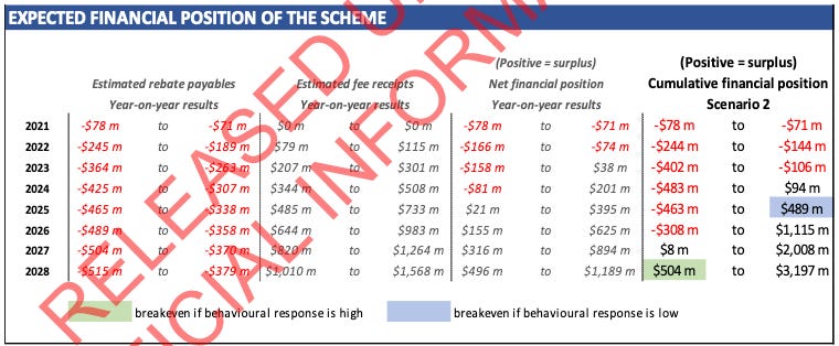 Here’s the table of expected revenues and rebates from the original Cabinet paper on the scheme, including a scenario where the take-up is much stronger than expected, which was eerily prescient in this aside: