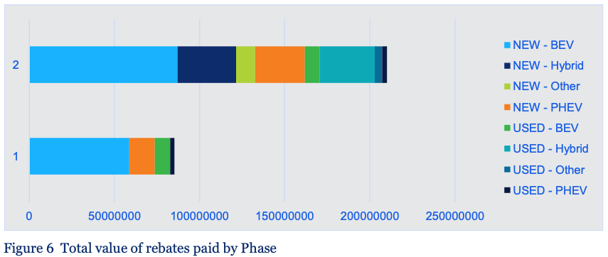 The primary rebate cost is for brand new EVs (from which benefits also derive) and the second highest cost is from hybrids and low emission vehicles (split evenly between new and used).