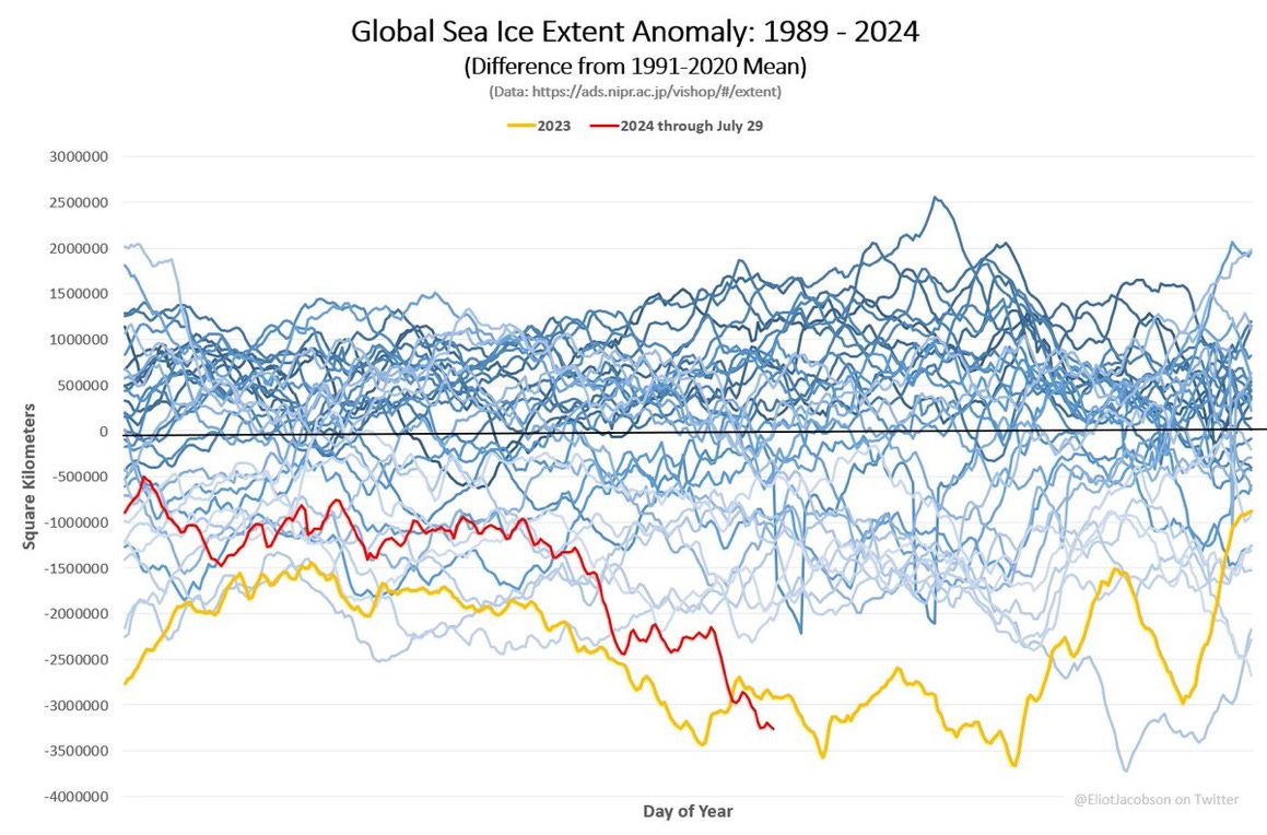 In climate graphic of the day, Fresh data collected in the last week shows global ice levels hit record lows for this time of the year, consistent with global temperatures accelerating faster than expected past 1.5 degrees over pre-industrial levels.