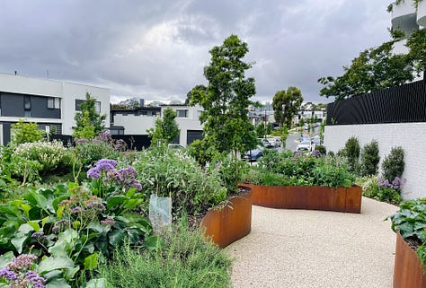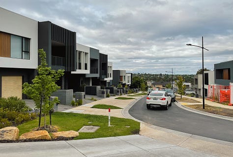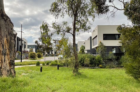 Last week Lynn and I stayed at a friend’s apartment built by Mirvac as part of a massive planned development on the former Eastern Golf Course about 13 kms from Melbourne’s CBD. They kept all the trees and built a wide range of up-and-down-market townhouses with apartment blocks on the margins, with large green spaces/ walking trails chock full of public playgrounds and adjacent barbecue areas. It’s a real living space and a lovely place to walk around.