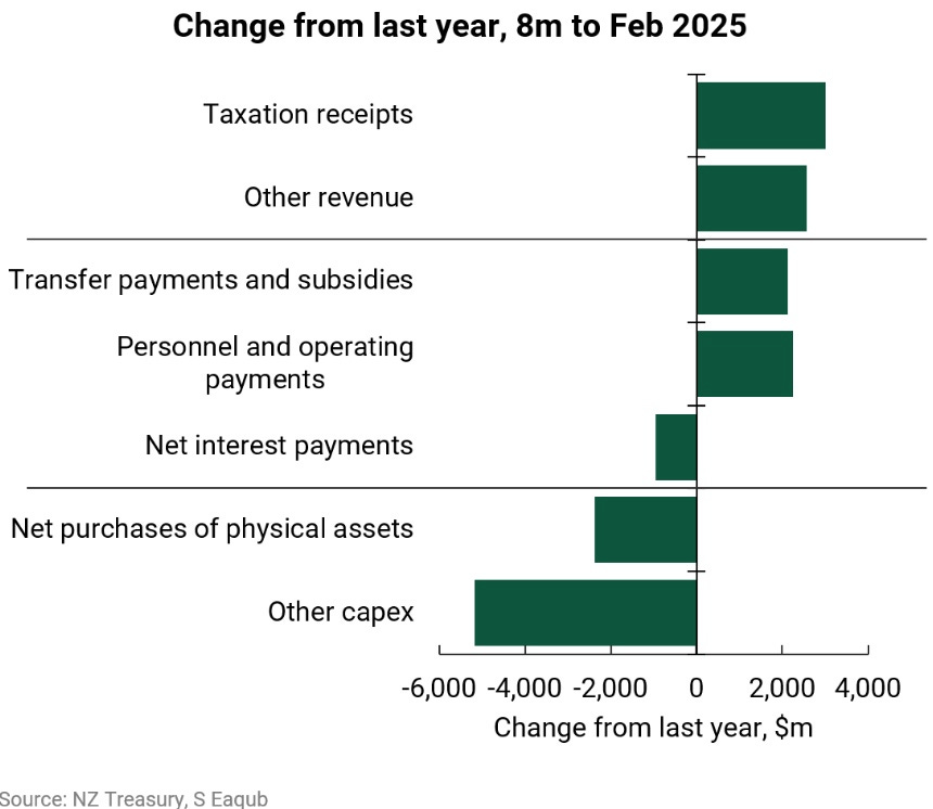 Shamubeel Eaqub: For the first eight months of this financial year, spending on pretty much all the OPEX (Operating Expenditure) items are up, with the exception of net interest, and all the kind of big reductions were on the investment side of things. It doesn't mean that they haven't made cost savings. Those things might have increased a lot more without those pressures. But because they've had those big tax cuts that came in when they were first elected, there's just less money around to be able to balance the books.