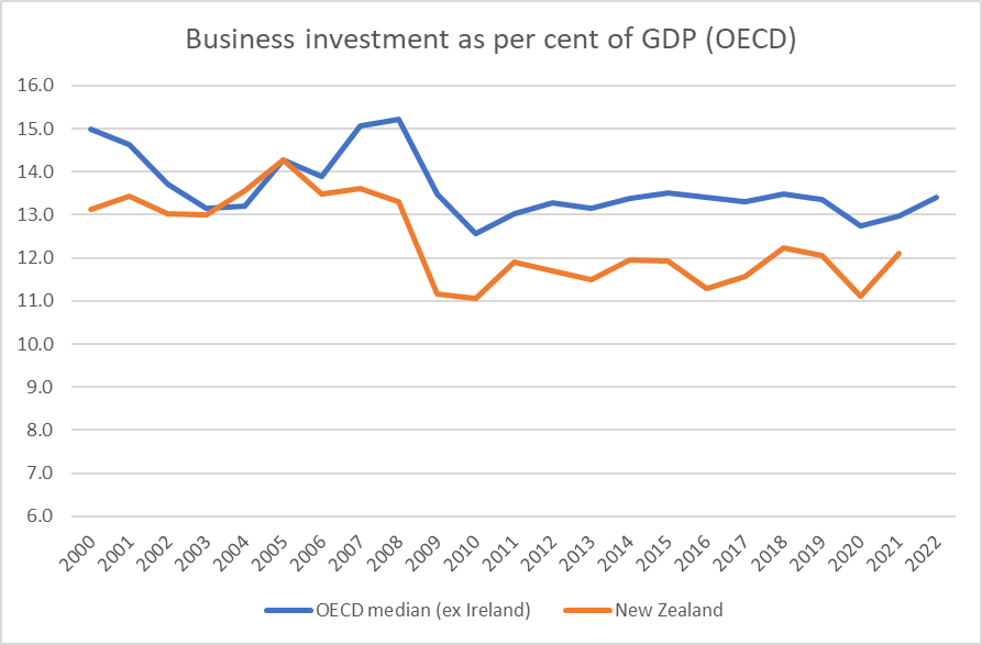 having one of the lowest public infrastructure and business investment rates in the OECD because of the need for low taxes and to put surpluses from wages and profits into residential land, which starves the economy of investment in roads, transport, machinery, business innovation and intellectual property that would increase productivity and real wages;