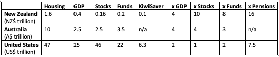 This royally skewed set of incentives is why our housing market is worth NZ$1.6 trillion, which is four times our GDP (NZ$400 billion), 10 times the value of our listed companies (NZX total market value of $160 billion), eight times larger than our total managed funds sector ($200 billion including NZ Super Fund and ACC) and 16 times larger than our only-very-marginally-incentivised household pension funds (Kiwisaver at $100 billion). For comparison, Australia’s housing market is worth the same four times GDP, but is worth four times stocks, three times and funds under management. In the United States, its housing market is worth twice GDP, once the stock market, twice funds under management and 7.5 times its comparable ‘subsidised’ household pensions market, which is known as 401k in America, rather than KiwiSaver.