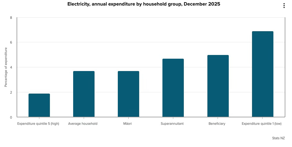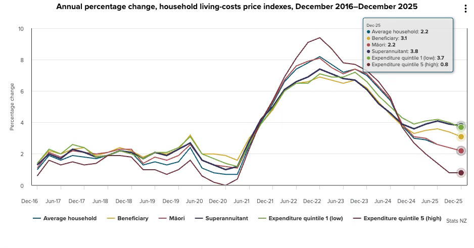 Chart Pack of the Day: Stats NZ’s Housing Living Costs Indices published yesterday showed the poorest 20% of households, beneficiaries and pensioners experienced significantly higher inflation in the last year than the Consumer Price Index inflation measure of 3.1% reported last month, and higher than the 0.8% experienced by the richest 20%, who benefited from lower mortgage costs.