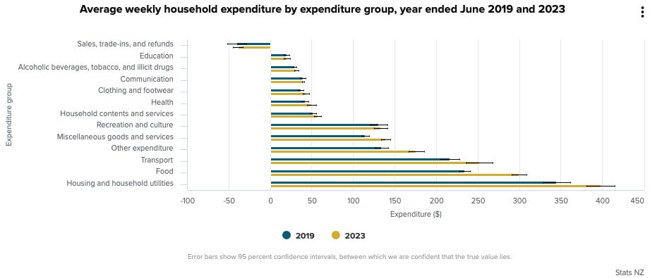 The biggest increases in household living costs have been around housing (including rents, mortgage costs, rates and repairs) food and transport costs, as indicated in household living cost indices published yesterday by Stats NZ. They showed average weekly household expenditure on housing, food and transport rose 20% to $950 a week between 2019 and 2023, with domestic air transport costs rising 89.6%, property rates rising 27% and private car costs rising 26%.