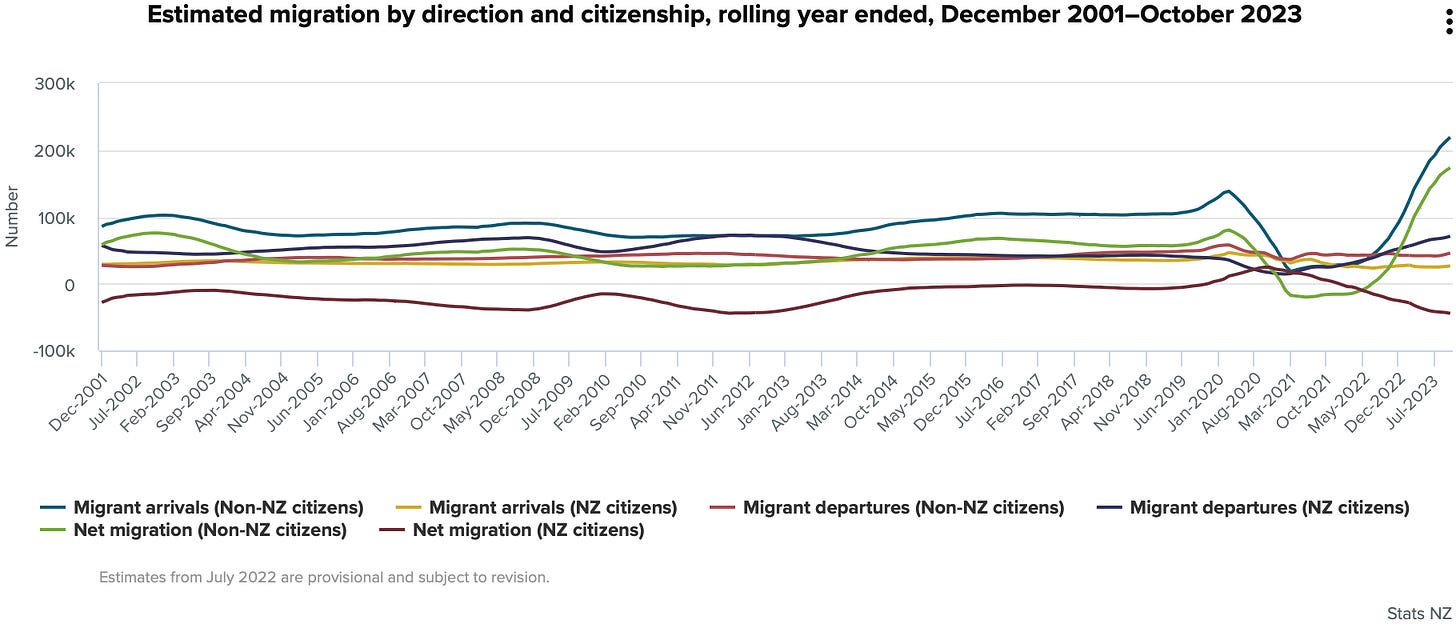 TL;DR: Net migration hit a record high 128,900 in the year to October, which the new Government has decided is “unsustainable” and requires a review of settings to ensure it is “balanced” with the economy’s skills needs and infrastructure capacity.
