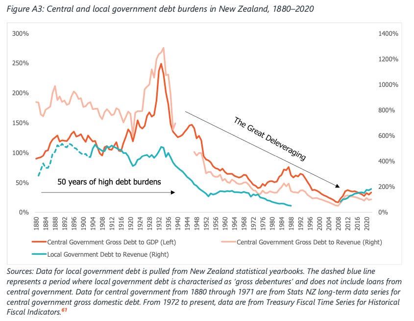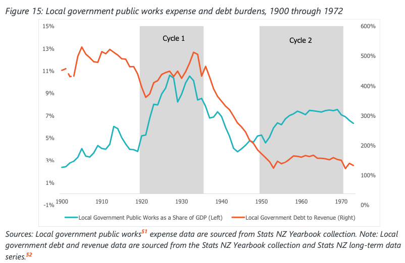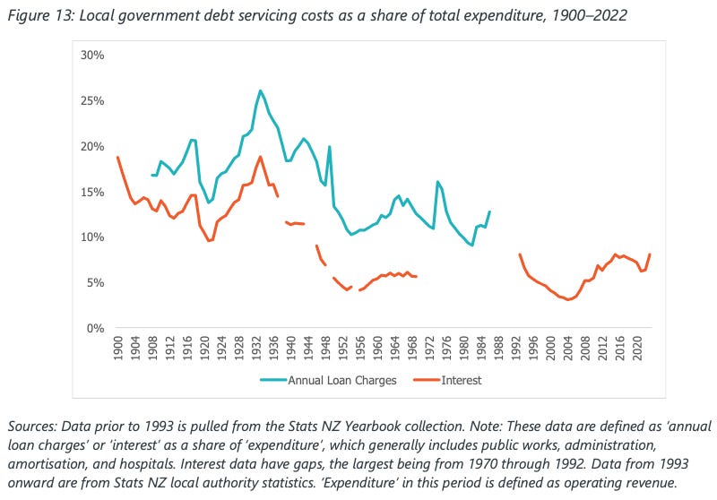 Further, while council debt burdens have been growing of late, history also tells us that they’ve been significantly more indebted in the past, as measured by their debt-to-revenue ratios. In the 40 years prior to the Second World War, local government sustained debt burdens that were four to five times greater than they are today. Te Waihanga-NZ Infrastructure Commission review of council borrowing published on Thursday.