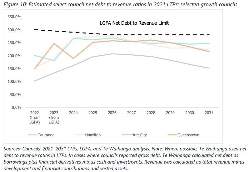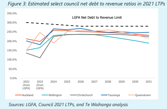 A review of council borrowing has found central Government-driven debt limits are strangling big councils’ ability to borrow to build enough infrastructure for growth, although some councils are further tightening the reins with even lower self-imposed limits and by over-playing fears of credit rating downgrades (see more detail and analysis below and in the podcast above, which includes my interview with Te Waihanga-Infrastructure Commission Director of Economics Peter Nunns1);