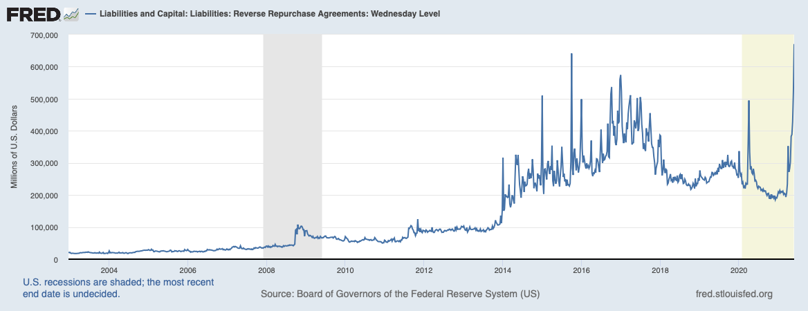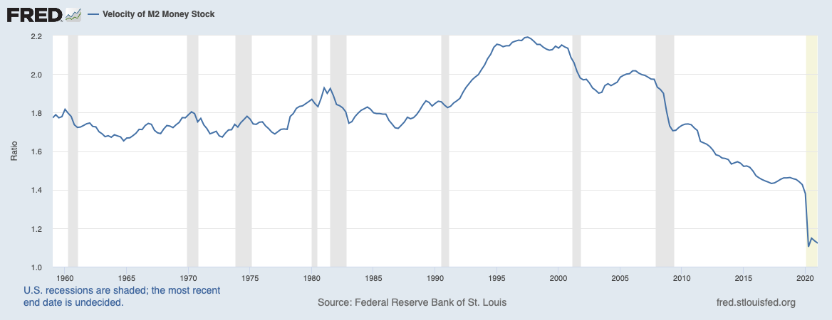 Many inflationistas argue ‘this time is different’ and that the US$10t of fresh cash printed to buy bonds from banks and pension funds will eventually start circulating among real investors and consumers, boosting real prices. That remains an open question and the history over the last 20 years is dominated by a slowing circulation of the global money supply as risk-averse and older investors stash away ever-more cash and wealth in unproductive bank accounts and stores of value, rather than in productive assets or in spending. The first priority of very, very rich investors is always to preserve wealth, and the scale of the wealth now concentrated among the wealthiest is impossible to spend quickly or widely. The three charts below show how much wealthier they’ve gotten, how so much money is now parked back in the US Federal Reserve, and how slowly all the freshly-printed US cash circulates as it’s stashed away rather than invested or spent on goods and services.