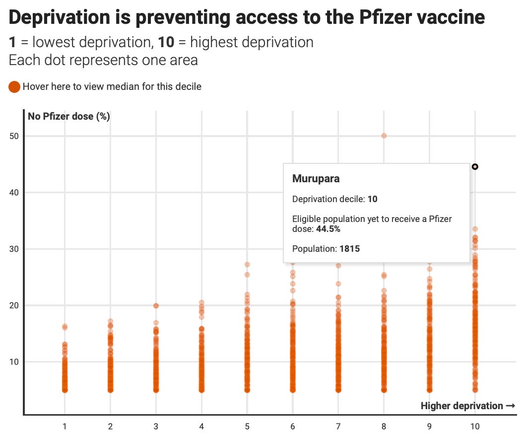 Chart of the week: This Stuff chart shows the towns in each decile with the highest percentages without any Pfizer doses. Each red dot represents a suburb and the shade of red represents the number of people unvaccinated. Decile 9 and 10 towns predominate. Vaccination rates are highly negatively correlated with deprivation.