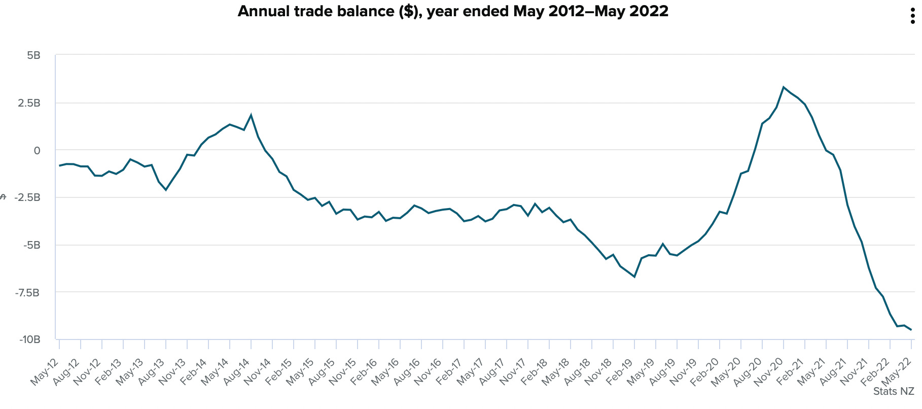 $9.5b - Stats NZ reported yesterday Aotearoa-NZ’s annual merchandise (goods) trade deficit was $9.5b in the year to the end of May 2022, vs a deficit of $49m the previous year. Goods exports were valued at $67.2b for the year, up $7.7b from the previous year. Annual goods imports were valued at $76.7b, up $17.1b from the previous year.