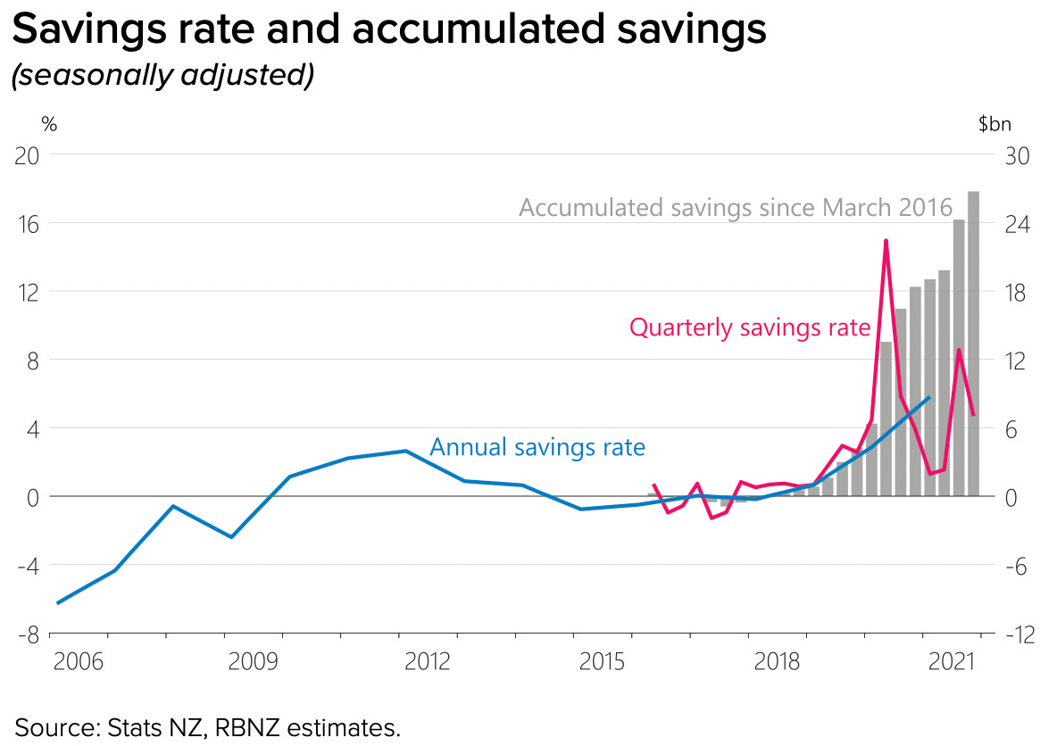 One result of that was the banks and fund managers capturing a margin on the way through on the money roundabout. Also, interestingly, the Government never actually spent all of the $55b in freshly printed money it received in that roundabout way. There is still $33.4b sitting in the Crown Settlement Account with the Reserve Bank, the Reserve Bank’s data shows. The difference of $22b almost exactly matches the $23b in extra household and business savings seen in the above chart.