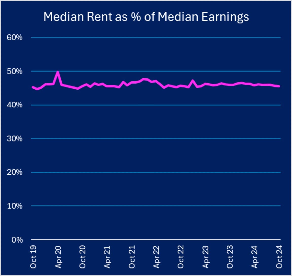 New charts below show how rents rise almost exactly in step with incomes, with almost half of median renters’ incomes consumed by rents, although occasional surges in supply when the usual rules restricting development are broken can soften the link.