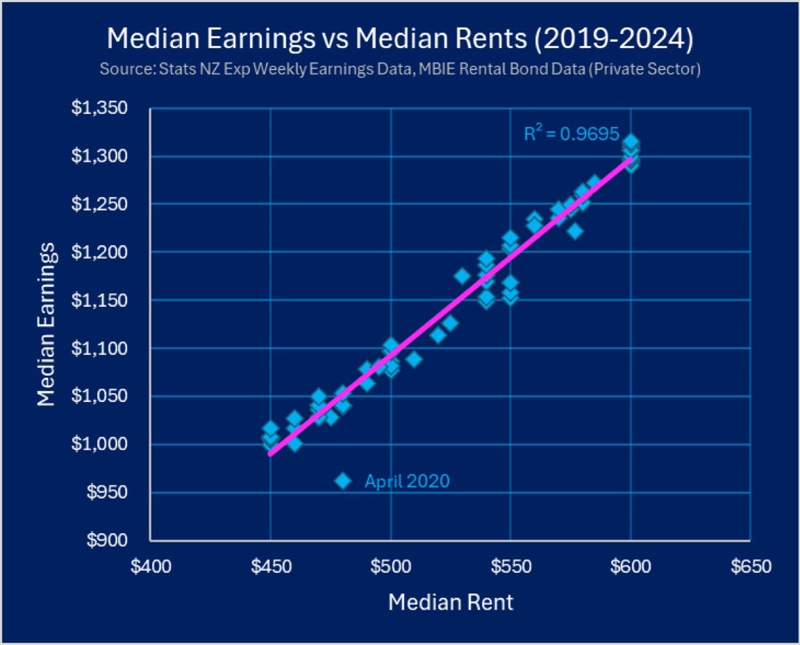 As Musical Chairs points out via BlueSky, just under 50% of median earnings of renters in New Zealand are consumed by rent and the relationship is remarkably correlated. But there is hope, because the link was softened in Auckland after the Unitary Plan allowed (some) more densification and in Christchurch from 2013 after the Government broke its own rules about local infrastructure funding by borrowing to pay for it, and by effectively suspending the RMA in the years after the earthquake.