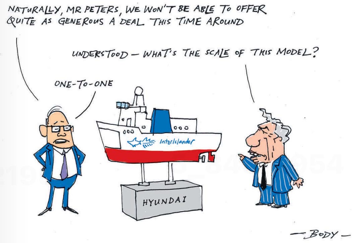 Elsewhere, Foreign Affairs and Rail Minister Winston Peters met with Hyundai executives in South Korea on Friday to talk about building smaller ferries than the ones Hyundai started, before Finance Minister Nicola Willis cancelled them abruptly with a $500 million break fee (see Cartoon of the day below). RNZ