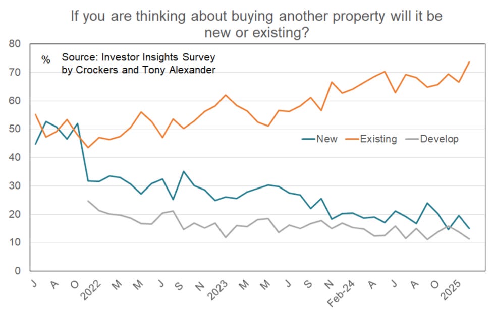 Rental property investors and mortgage brokers have reported in Tony Alexander’s recent monthly surveyes they are pulling back from the market, with selling intentions at record highs, net buying intentions near record lows, and intentions to buy new homes, build new homes or develop new homes near record lows.