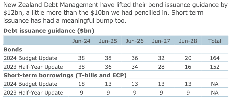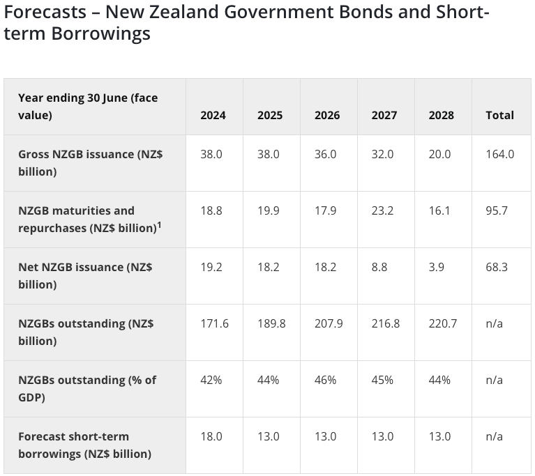 Here’s the table released yesterday NZ Debt Management Office in Treasury showing the increased borrowing: