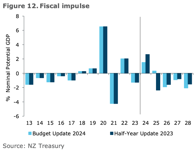 The new Government also promised not to increase inflation pressures with its tax cuts and spending. That assertion can also be challenged, given a slightly larger fiscal stimulus is expected this year, before bigger contractions follow in the next three years. Some economists said the tax cuts and some early capital expenditure may add a little to the inflationary pressures the Reserve Bank is dealing with this year. Most said Budget 2024 was unlikely to force interest rates any higher, but may further delay mortgage rate relief into next year.
