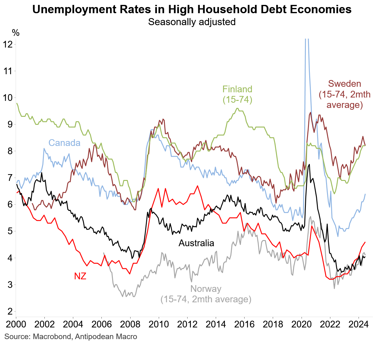 Economy: Stats NZ reported 4.6% unemployment in the June quarter, the highest rate since March 2021, with almost half the 1% rise since last year accounted for by young people. Notes: Westpac said the unemployment rise fulfilled the RBNZ's May projection, while BNZ predicts another roughly 1% rise in unemployment over the coming 12 months. ANZ predicted the RBNZ will leave the OCR at 5.50% next week, but wouldn’t rule out a cut.