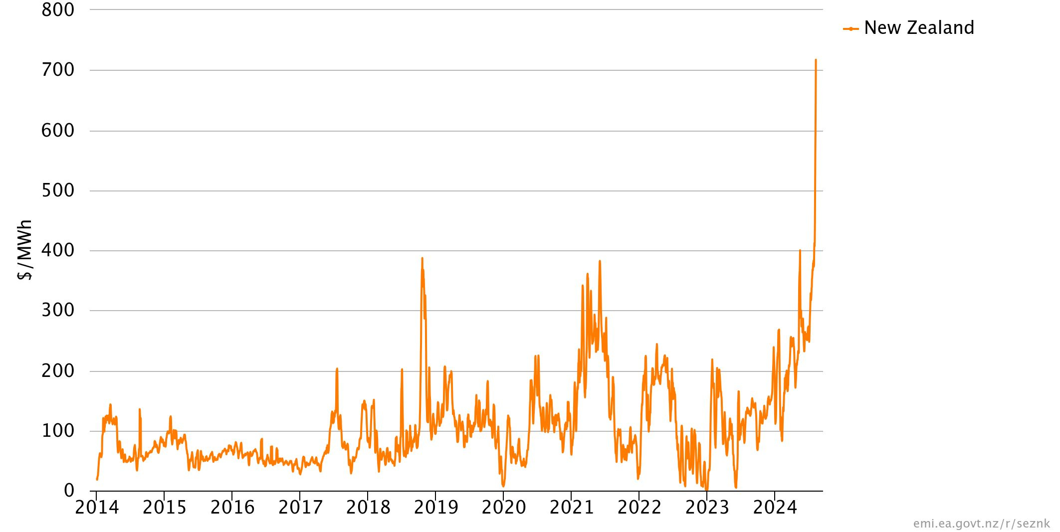 NZ wholesale electricity price (7-day moving average)