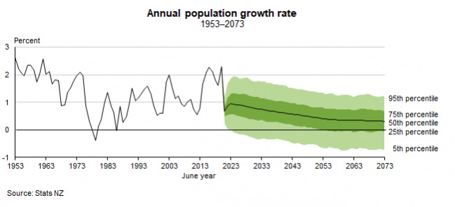 Stats NZ’s most recent median projection was that our population would rise by around 0.6% per year 5.13m to 6.35m by 2053, assuming around 25,000 of net migration each year. Its high net migration of 50,000 a year, which is closer to what we’ve seen over the last decade, would push the population up to 7.36m by then. See bottom chart below of various population growth rates forecast.